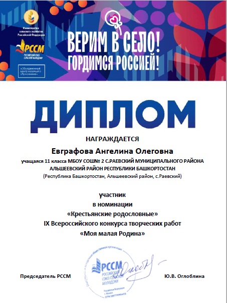 Обучающаяся 11 класса МБОУ СОШ №2 с. Раевский приняла участие в IX Всероссийском конкурсе творческих работ "Моя малая Родина" и награждена Дипломом участника в номинации "Крестьянские родословные". Поздравляем!!!