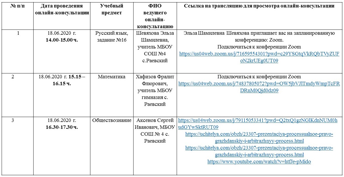 18 июня с 14:00 до 17:30 пройдут онлайн - консультации по подготовке к ЕГЭ по русскому языку, математике и обществознанию.